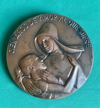 GRAN MEDALLA DE BRONCE EN RELIEVE CONMEMORATIVA DEL CENTENARIO 1881-1981 DEL FUNDADOR DE LAS HERMANAS HOSPITALARIAS DEL SAGRADO CORAZÓN DE JESÚS . EN EL ANVERSO TIENE EL RETRATO DE BENITO NENNI FUNDADOR EN EL REVERSO UNA HERMANA ATENDIENDO A UNA PERSONA Y LA LECTURA DE 100 AÑOS DE AMOR AL QUE SUFRE. EN PERFECTO ESTADO DIÁMETRO 8CM X 0,5CM DE GROSOR.