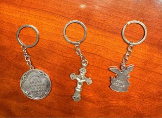 Conjunto de tres llaveros con motivos religiosos. - Llavero con medalla del Sagrado Corazón. - Llavero con cruz ornamentada. - Llavero con figura de ángel. 1 llavero 7 € 2 llaveros 12 € 3 llaveros 15 €