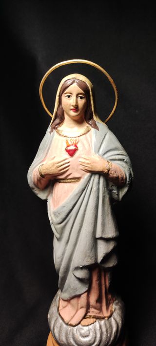 Figura religiosa de barro de la Virgen María como Sagrado Corazón -Realizada en barro `policromado. Murcia, años 1950. Ver detalles y medidas en las fotos adicionales. antigua, antiguedades,escultura, talla, religiosa, medalla, vintage