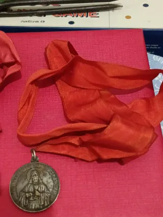 Medalla antigua con un diseño circular y detalles en esmalte. - Diseño central del Sagrado Corazón de Jesús. - Borde circular con inscripciones. - Colores: dorado, rojo, azul y blanco.