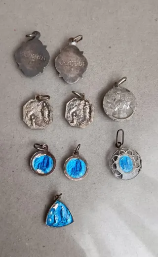 Conjunto de 9 medallas antiguas. -1 medalla Virgen del Pilar /Sagrado Corazón - 2 medallas iguales, Virgen de Montserrat (Moreneta) Inscripción V. S. Montserrat y una estrella de 5 puntas. -2 iguales, con forma octogonal, Virgen de Lourdes. - 2 iguales Virgen de Lourdes, esmalte azul. - 1 de forma triangular, Virgen de Lourdes con acabado bicolor azul. -1 redonda con filigrana, Virgen de Lourdes, lacado azul. - Material: Plata - Diseño: Variado con figuras religiosas