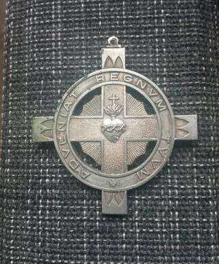 Medalla en forma de cruz con la imagen del Sagrado Corazón de Jesús entre las horas de un reloj. En el reverso presenta la inscripción "Adveniat Regnum Tuum". En el centro, un corazón flameante coronado con una cruz Material: metal plateado Es una medalla muy rara y curiosa