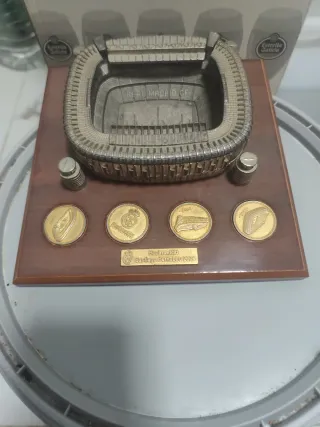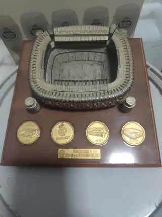 Réplica detallada del Estadio Santiago Bernabéu. - Base de madera. - Incluye cuatro medallas conmemorativas.