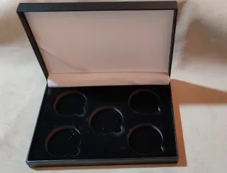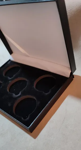 Elegante caja para guardar monedas o medallas. - Interior forrado en terciopelo negro. - Compartimentos circulares para protección. - Tapa con acabado interior en tela blanca - 2 huecos para Medalla de 2 Onzas 60 mm y 3 huecos para Moneda o Medalla de 1 onza o 10€.. 40mm
