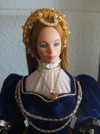 Muy raro y difícil de encontrar. En excente estado, con urna de cristal. Años 80. Muñeca del renacimiento con un lujoso vestido de terciopelo forrado en raso, bordes dorados, perlas y rubis falsos, anillos en los dedos, medalla. Zapatos y medias blancas. Las medidas son las de la urna de cristal. Entra en mi perfil para ver más artículos en oferta.