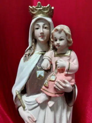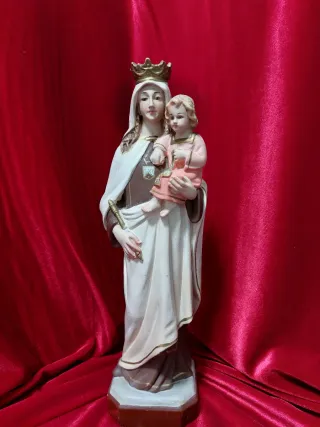 Figura de la Virgen del Carmen, estilo Olot, con una altura de 36 cm. Representa a la Virgen con el Niño Jesús en brazos. - Detalle de corona dorada. - Túnica marrón con detalles dorados. - Manto blanco con motivos florales. - Incluye escapulario. Nacimiento pesebre belen olot misterio Medalla relicario rosario antigüedades Virgen del carmen escapulario Devocion mariana