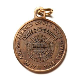 Conjunto de medallas e insignias antiguas de diferentes tipos. - Medalla dorada con inscripciones. - Insignia de los Oakland Raiders. - Medalla con figura de animal. - Insignia de MEATH. - Medalla con diseño de trébol.