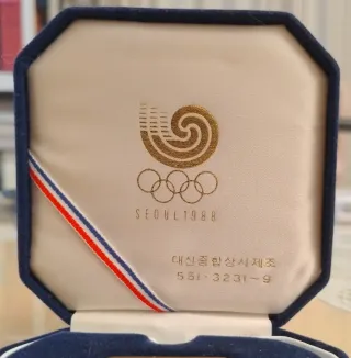 Medalla de los Juegos Olímpicos de Seúl 1988. Está medalla se entregaba a los participantes como recuerdo de su asistencia. Rara y en perfecto estado - Diseño con el emblema de Seúl 1988. - Incluye los anillos olímpicos. - Presentada en su caja original de terciopelo azul. - Detalle de cinta tricolor (rojo, blanco, azul) en la caja.