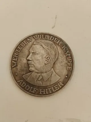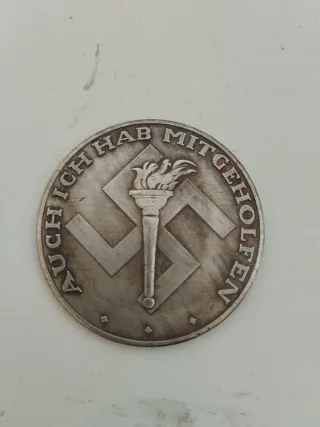 Medalla conmemorativa de Adolfo Hitler del año 1933. Presenta un diseño circular con un grabado central. - Diámetro aproximado de 5 cm. - Inscripción AUCH ICH HAB MITGEHOLFEN en el borde.