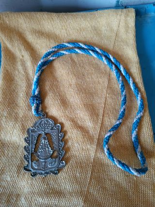 Antigua medalla o medallon de la hermandad de la Virgen del Rocío de Puerto Real, Cádiz con un diseño detallado y un colgante de ancla. Incluye tres cordones trenzados. - Diseño de la Virgen del Rocío. - Colgante con ancla. - Tres cordones trenzados (azul y blanco).