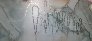 Conjunto de varios rosarios de diferentes estilos y materiales. - Incluye rosarios de cuentas moradas, rojas y plateadas. - Varios diseños de cruces y medallas. - Ideal para coleccionistas o devoción personal.