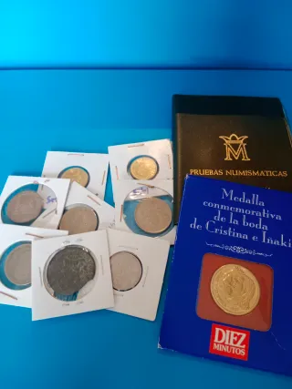Conjunto de artículos numismáticos que incluye monedas y una medalla conmemorativa. - Medalla conmemorativa de la boda de Cristina e Iñaki. - Colección de monedas. - Carpeta Pruebas Numismáticas.