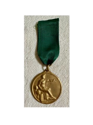 Antigua medalla al mérito académico. En relieve, la diosa Minerva de la sabiduría, artes, comercio e industria y estrategia militar. Cinta verde. Buen estado. Parece de bronce. (sabiduría escuela escolar académico instituto universidad clase educación formación emblema distintivo condecoración intelectual maestro maestra profesor alumno pedagogía alumna niño niña).