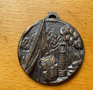 Medalla de bronce con un diseño detallado de un paisaje de montaña. - Representa una tienda de campaña y una mochila. - Incluye elementos de la naturaleza como árboles y montañas. - Tiene un colgador en la parte superior.