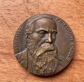 Medalla numismática con el retrato de Friedrich Engels. - Inscripción: FRIEDRICH ENGELS 1820-1895. - Diseño detallado del busto y barba.