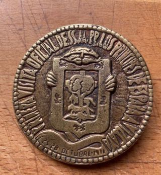 Medalla conmemorativa del XIX Centenario de la Venida de la Virgen del Pilar a Zaragoza, celebrada en el año 1940. Anverso: Muestra un relieve detallado de la Basílica de Nuestra Señora del Pilar en Zaragoza, con las inscripciones "CENTENARIO DE LA VIRGEN 1940" rodeando la parte superior y "ZARAGOZA" en la parte inferior. Reverso: Presenta una escena religiosa, que representa la aparición de la Virgen María al apóstol Santiago sobre la columna (el Pilar). Muy bien conservada. Ver foto
