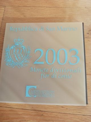 Conjunto de monedas de San Marino del año 2003. Cartera de 8 valores de 1 céntimo a 2 euros, más medalla conmemorativa de 5 euros. En cartera original