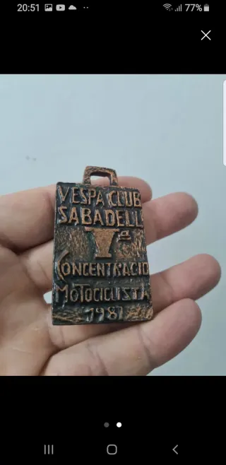 Medalla conmemorativa de un Vespa Club. Diseño único y detallado. - Material: Metal con acabado en bronce. - Diseño: Representación estilizada de una Vespa y un rostro. - Colgante: Incluye asa para cadena o cordón.