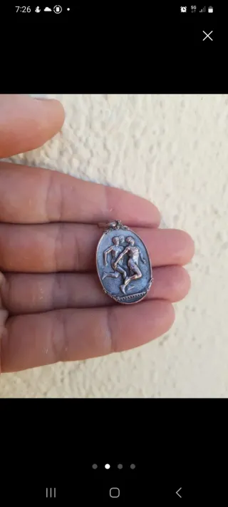 Bonita medalla ovalada con un diseño en relieve de atletismo del año 1930 toda una reliquia casi 100 años procedente de sabadell echa en cobre bañada en plata - Representa a dos figuras humanas entrelazadas. - Detalle de serpiente en la parte inferior. - Colgante de plata.