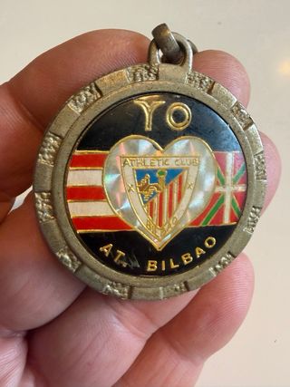 MÁS EN MI PERFIL Llavero Medalla del equipo de fútbol Athletic Club de Bilbao. AÑOS 70. Muy raro. Diseño circular con escudo del club. - Incluye las banderas de Vizcaya y Guipúzcoa y dorso tipo medalla con un jugador de fútbol en relieve - Texto YO QUIERO ATH. BILBAO grabado. # coleccionismo deportivo cromos liga de fútbol