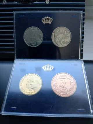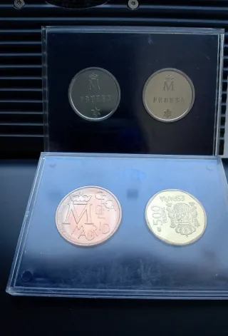 500 pesetas (pts, ptas) de 1987 Sin circular y acabado flor de cuño, FDC con fondo espejo y efigies en mate. Estas monedas se limpiaba el cuño después de cada acuñación, PROOF. Lo que hace tener un acabado superior a las monedas procedentes de cartucho. Más medalla de cobre y dos pruebas de acero. Moneda especial acuñada con los cuños vírgenes y que se incluyo en el pack Así se hace una moneda de pruebas de la F.N.M.T. para conmemorar el XXV Aniversario de la boda de SS.MM. los Reyes de España, D. Juan Carlos I y Dña Sofía. Ceca Madrid RCM FNMT