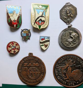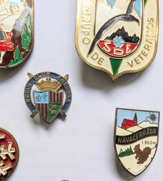 Colección de insignias y medallas de montaña. Son piezas antiguas y presentan un aspecto desgastado, lo que les da un encanto especia - Incluye 9 piezas: 5 insignias, 3 medallas y una placa. - Temática montañismo y senderismo. - Material variado: metal, bronce, plata etc.