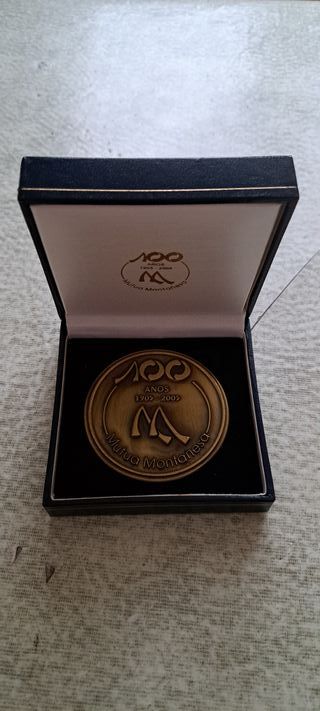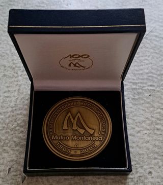 Medalla conmemorativa del centenario de Mutua Montañesa. - Diseño circular en tono bronce. - Grabado Primer Centenario Mutua Montañesa. - Fechas 1905 - 2005.