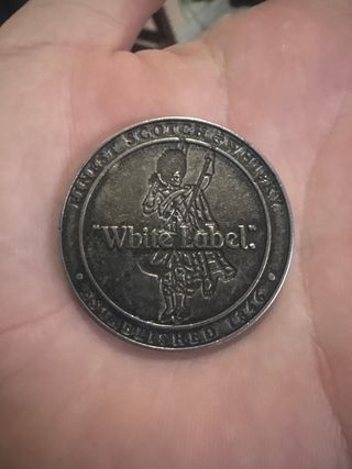 Moneda o medalla conmemorativa de White Label Scotch Whisky. - Diseño circular con figura de gaitero escocés. - Inscripción Finest Scotch Whisky y Established 1846.