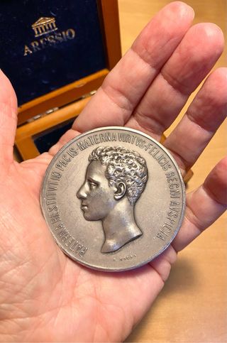 Medalla de plata conmemorativa de la mayoría de edad y proclamación como Rey de España de Alfonso XIII en 1902. Estuche madera (joyería ARESSIO). -Anverso: retrato del rey en perfil y el grabado PATERNA RESTITVTIO PACIS MATERNA VIRTVS FELICIS REGNI AVSPICIA. -Reverso: el rey presta juramento ante un ara con las insignias reales; a la derecha, la reina madre, y entre ambos, la alegoría de España levanta una rama de laurel; grabado: ALPHONSI XIII HISP. REG. CATHOL. AET. REG. IMPLETA ET OBSERV. CONSTIT. IVRATA. DIE XVII MAII. A. D. - Firma del grabador BARTOLOMÉ MAURA en la parte inferior. -Peso 110 gr. -Diámetro 6 cm, grosor 40 mm.