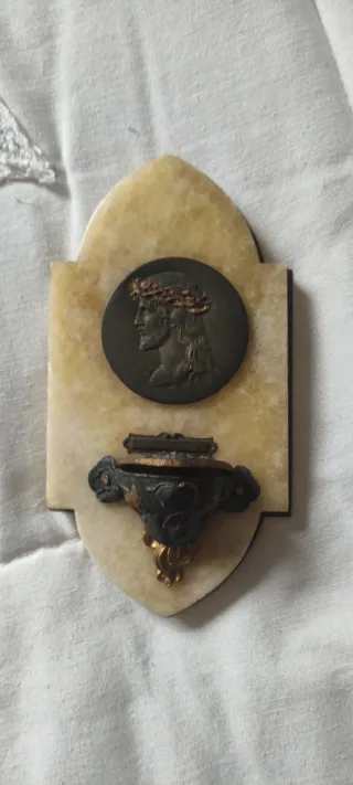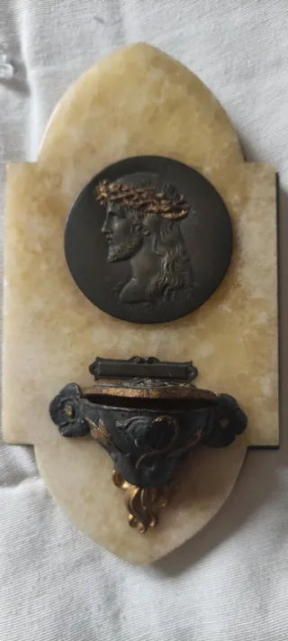Antigua benditera con base de mármol y detalles en bronce. Presenta una medalla con la imagen de Jesucristo. - Base de mármol veteado. - Medalla de bronce con Jesucristo. - Pequeño recipiente para agua bendita.