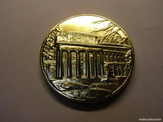 Moneda de metal con acabado dorado. Mide 5 cm. de diámetro, y pesa 58 gramos. - Diseño detallado de edificio con columnas. - Grabado de paisaje montañoso en la parte superior. - Inscripción en la base del edificio.