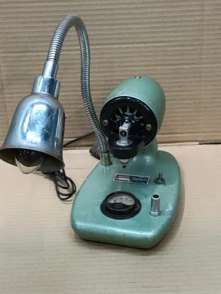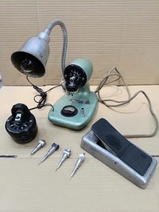 Conjunto de máquina para coser medias, con lámpara y accesorios. - Base de máquina color verde menta. - Lámpara flexible metálica. - Pedal de control. - Varios accesorios de puntas y motor de repuesto. Desconozco si funciona, pues es de 110v. Y no la he enchufado.