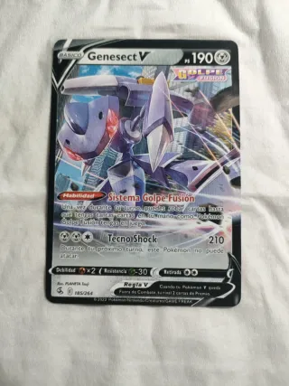 Carta Pokémon de Genesect V, número 185/264. - Tipo: Básico - PS: 190 - Habilidad: Sistema Golpe Fusión - Ataque: Tecno Shock (210 PS) - Debilidad: Fuego x2 - Resistencia: Planta -30 - Retirada: 2