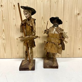 Conjunto de figuras antiguas de Don Quijote y Sancho Panza. Representan a los icónicos personajes de la literatura española. - Figuras de papel maché. - Incluye bastón y cesta.