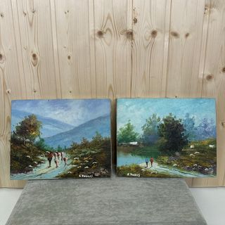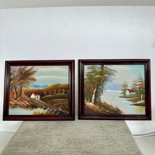 Conjunto de dos cuadros pintados a mano, con escenas de paisajes. - Estilo de los años 80. - Marcos de color burdeos. Precio por la pareja