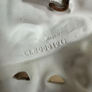Máscara veneciana elaborada con detalles ornamentales. - Diseño con plumas doradas y moradas. - Adornos de pedrería en azul y verde. - Rostro blanco con labios rojos. - Acabado brillante y texturizado.