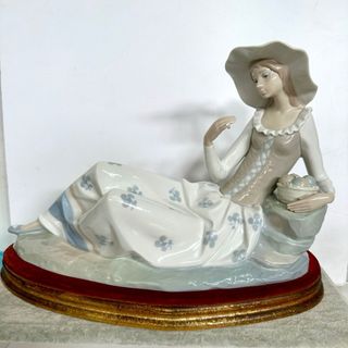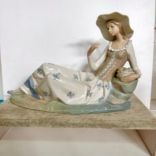 Figura de porcelana de Nao de la casa Lladró que representa a una mujer con sombrero, recostada y con una cesta de frutas. Solo tirne un detalle en la mano ( le falta una hoja pequeña ) no se nota - Diseño detallado y elegante. - Tonos pastel suaves. Regalo peana de madera