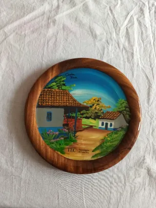 Plato decorativo con una escena pintada de Costa Rica. Ideal para coleccionistas o como recuerdo. - Pintura de una casa típica costarricense. - Marco de madera. - Incluye logo de TEC (Tecnológico de Costa Rica).