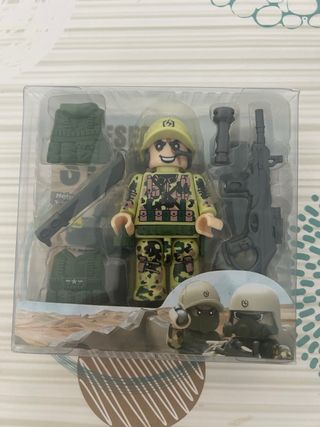 Figura de soldado militar estilo playmobil con varios accesorios. - Incluye chaleco táctico. - Incluye rifle de asalto. - Incluye cuchillo. - Incluye casco.