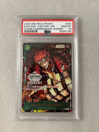 Carta promocional de Eustass Captain Kid del campeonato de tienda de 2023. - Grado PSA 10 Gem MT. - Número de carta: #003. - Edición especial Store Championship-Winner.