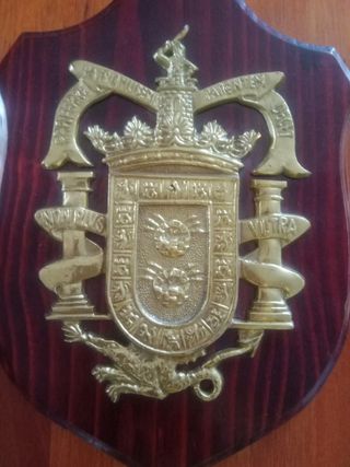 Conjunto de dos metopas militares con escudos y coronas. - Una metopa con el escudo del Regimiento de Infantería San Fernando 11. - Placa conmemorativa con nombre y fecha. - Otra metopa con escudo y BING XXXI.