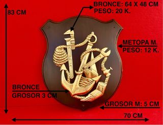 * ESPECTACULAR METOPA O ESCUDO NAVAL, DE LA ARMADA ESPAÑOLA, ESTA EN PERFECTO ESTADO, COMO SE PUEDE VER Y COMPROBAR EN LAS FOTOS, PROCEDE DE COLECCION PRIVADA * MEDIDAS = * 83 CM X 70 CM = * PESO 32 K. PERTENECIO AL ALTO MANDO DE LA ESCUELA TECNICA SUPERIOR DE INGENIEROS DE ARMAS NAVALES ( CIUDAD UNIVERSITARIA / MADRID ) * SIMBOLOGIA DE LA METOPA * 1º ) ANCLA = SIMBOLIZA LA TRADICION NAVAL Y LA RELACION CON LA ARMADA * 2º ) LLAVE GRIFA = ( STILLSON WRENCH ) REPRESENTA EL TRABAJO MECANICO Y LA INGENIERIA APLICADA A LOS SISTEMAS NAVALES * 3º ) ESCUADRA Y COMPAS = SIMBOLOS CLASICOS DE LA INGIENERIA Y LA CONSTRUCCION NAVAL * 4º ) SOPLETE Y TUBO = HACEN REFERENCIA A LA SOLDADURA Y EL TRABAJO CON MATERIALES METALICOS EN EL MANTENIMIENTO DE LOS BUQUES * 5º ) CABO ( CUERDA ) ENROLLADO = REPRESENTA LA INTEGRACION DE LA INGENIERIA CON LA OPERATIVIDAD NAVAL * PIEZA QUE POR SU TAMAÑO * 83 CM X 70 CM ES MUY POCO COMUN DE VER YA QUE SON DE MUY ALTA CALIDAD, MADERA NOBLE MACIZA * 5 CM Y BRONCE MACIZO * 3 CM DE FABRICACION ARTESANAL, DISEÑADA PARA RESISTIR EL PASO DEL TIEMPO Y LAS CONDICIONES CLIMATOLOGICAS * ESTA PIEZA FUE UN REGALO INSTITUCIONAL * ( AÑOS 4O ) DEL ALTO MANDO DEL CUERPO DE INGENIEROS DE LA ARMADA ESPAÑOLA AL * CRUCERO CANARIAS ( 1936 -- 1975 ) PARA SU COLOCACION EN LA SALA DE OFICIALES * ESTA METOPA O ESCUDO ES UNA PIEZA MUY IMPORTANTE Y DE UN GRAN VALOR HISTORICO Y CON MUCHO AÑOS DE ANTIGUEDAD ** CADA ARTICULO O PIEZA QUE PONEMOS A LA VENTA SON SIEMPRE 100% ORIGINALES, LA GRAN MAYORIA PROCEDE DE COLECCIONISTAS PROFESIONALES ** NOS ASEGURAMOS SIEMPRE DE CONOCER LA HISTORIA DE CADA UNA DE NUESTRAS PIEZAS Y QUE ESTEN EN PERFECTO ESTADO DE CONSERVACION, LIMPIEZA Y USO Y QUE TODOS SUS COMPONENTES SEAN SIEMPRE ORIGINALES grifo de cerveza,bronce,metal,porcelana,cruzcampo,heineken,san miguel,naval,barco de guerra,astillerros,el ferrol,cabo armada española,corbeta,destructor,antiguedades,noray,telegrafo marino,velas,yate,home