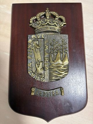 Placa decorativa con el escudo de Ferrol. Ideal para coleccionistas o amantes de la historia. - Diseño en relieve con acabado dorado. - Base de madera.