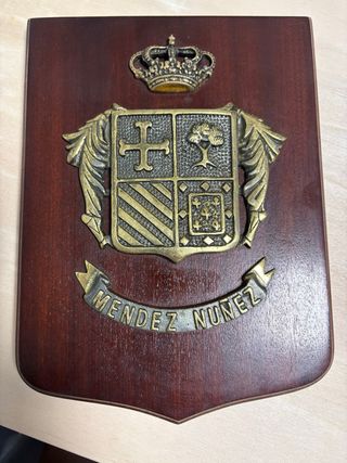 Metopa decorativa con escudo de Marina de Castilla - Diseño detallado en metal. - Base de madera. - Ideal para coleccionistas o decoración temática.