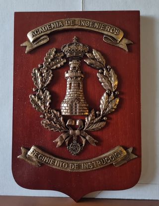 Metopa militar para decorar pared de la Academia de Ingenieros. - Emblema metálico con corona y torre. - Corona de laurel. - Cinta con Regimiento de Instrucción.