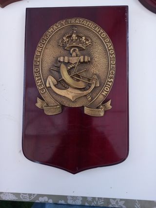 Preciosa placa conmemorativa del Centro de Programas y Tratamiento de Datos de Gestión. Es una pieza elegante y decorativa, ideal para coleccionistas. - Placa de madera oscura con relieve dorado. - Escudo con ancla y corona real. - Perfecto estado de conservación.