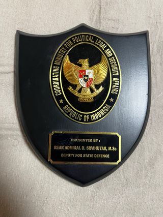 Metopa conmemorativa del Ministerio de Coordinación para Asuntos Políticos, Jurídicos y de Seguridad de Indonesia. Se presenta en una placa negra con forma de escudo.