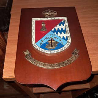 Metopa conmemorativa de la botadura del B.C. Teneo. Es una pieza elegante y detallada. - Metopa de madera con escudo. - Diseño náutico con anclas y timón. - Escudo con imagen del barco y el nombre B.C. Teneo. - Grabado con fecha en números romanos (MCMXCII). -Medidas: 17x24