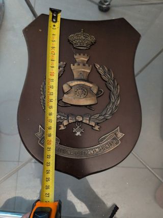 Metopa militar de la Unidad Regional de Transmisiones. Es una pieza elegante y decorativa. - Metopa con escudo de madera oscura. - Escudo con relieve dorado de teléfono, corona y elementos decorativos. - Inscripción "Unidad Regional de Transmisiones".