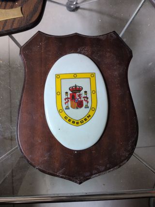 Preciosa metopa del CESEDEN (Centro Superior de Estudios de la Defensa Nacional). Es una pieza única para coleccionistas. - Metopa de madera oscura con escudo. - Escudo con el emblema de España. - Presenta un diseño clásico y elegante. - Ideal para decoración o coleccionismo.